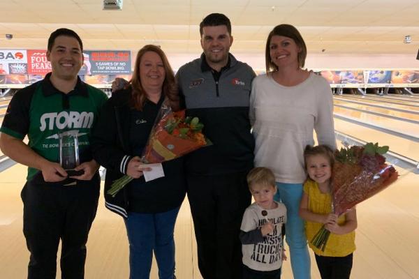 Pictured L To R Are: 2019 Mesa East Regional Champion Jordan Jung. Mesa East Bowl Manager, Erika Schwarze. Josh Blanchard, Amiee Blanchard, And Their Two Children. Photo Courtesy Of Josh Blanchard.